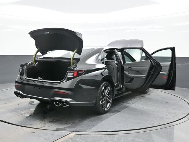 Abyss Black 2026 Hyundai Sonata N Line FWD 8-Speed I4 Dark Gray. Dark Gray, 12 Speakers, 19 x 8.0J Aluminum Alloy Wheels, 4-Wheel Disc Brakes, ABS brakes, Air Conditioning, Alloy wheels, AM/FM radio: SiriusXM, Apple CarPlay & Android Auto, Auto High-beam Headlights, Auto-dimming Rear-View mirror, Automatic temperature control, Brake assist, Bumpers: body-color, Cargo Tray, Delay-off headlights, Driver door bin, Driver vanity mirror, Dual front impact airbags, Dual front side impact airbags, Electronic Stability Control, Exterior Parking Camera Rear, Four wheel independent suspension, Front anti-roll bar, Front Bucket Seats, Front Center Armrest, Front dual zone A/C, Front reading lights, Fully automatic headlights, Heated door mirrors, Heated front seats, Heated N Unique Sport Seats, Illuminated entry, Knee airbag, Leather steering wheel, Leatherette/Suede Combination Seating Surfaces, Low tire pressure warning, Navigation System, Occupant sensing airbag, Outside temperature display, Overhead airbag, Overhead console, Panic alarm, Passenger door bin, Passenger vanity mirror, Power door mirrors, Power driver seat, Power moonroof, Power steering, Power windows, Radio data system, Rear anti-roll bar, Rear seat center armrest, Rear side impact airbag, Rear window defroster, Remote keyless entry, Security system, Speed control, Speed-sensing steering, Speed-Sensitive Wipers, Split folding rear seat, Spoiler, Sport steering wheel, Steering wheel mounted audio controls, Tachometer, Telescoping steering wheel, Tilt steering wheel, Traction control, Trip computer, and Variably intermittent wipers.