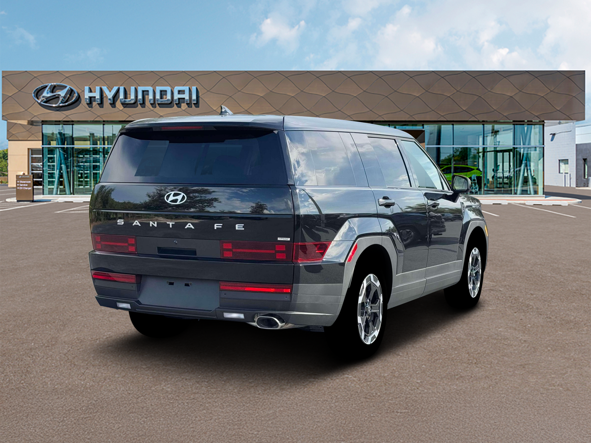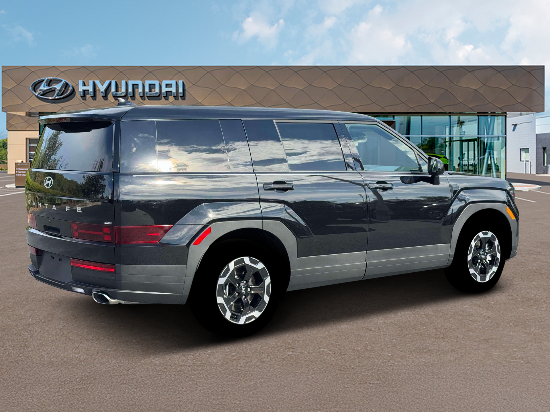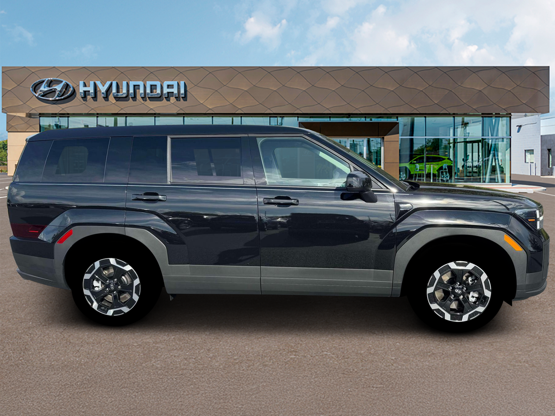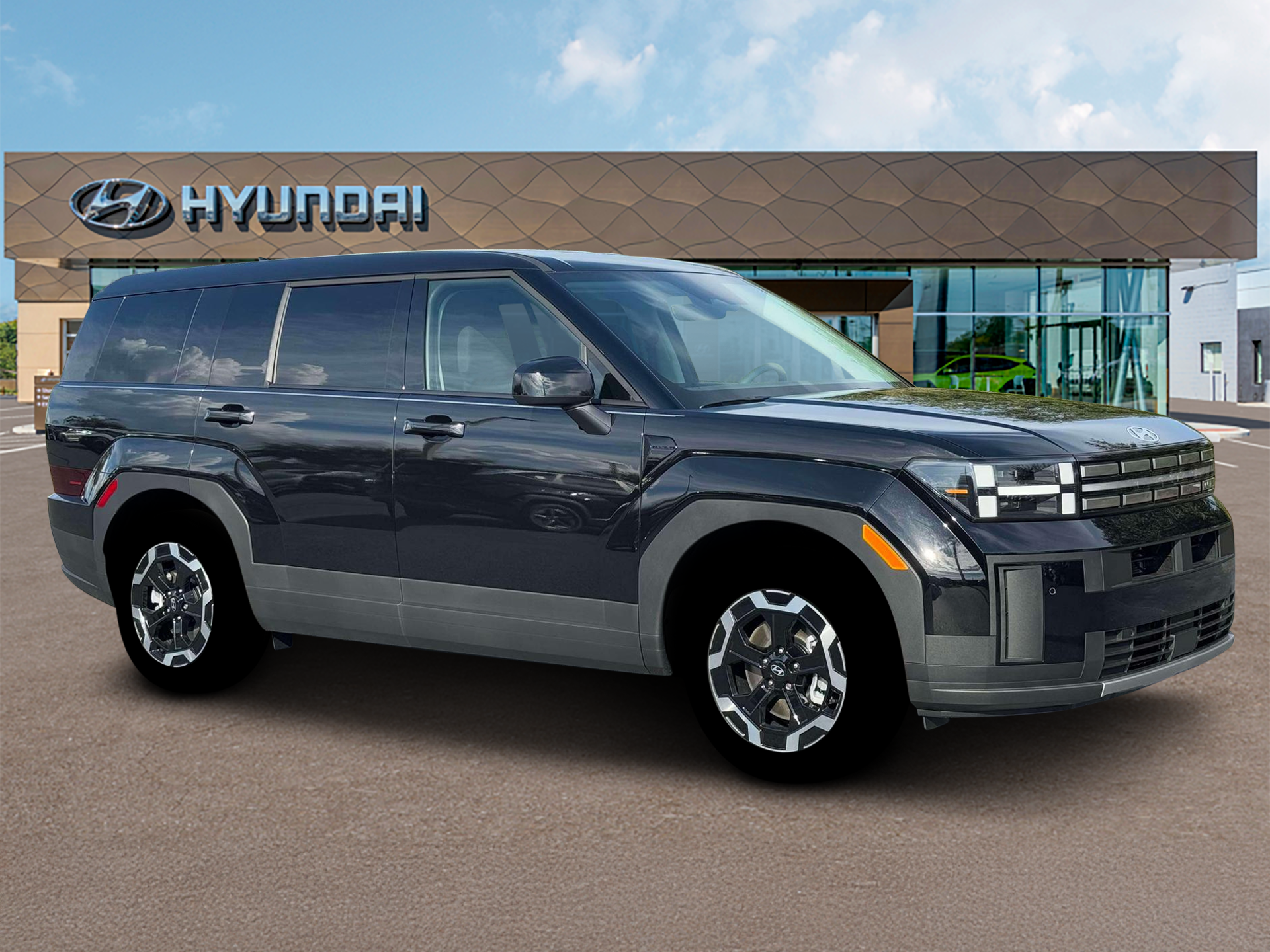 Phantom Black 2026 Hyundai Santa Fe SE AWD 8-Speed Automatic with SHIFTRONIC 2.5L I4 AWD, Black Cloth. Option Group 01, AWD, Black Cloth, 18 x 7.5J Alloy Wheels, 3rd row seats: bench, 4-Wheel Disc Brakes, 6 Speakers, ABS brakes, Air Conditioning, Alloy wheels, AM/FM radio: SiriusXM, Apple CarPlay & Android Auto, Auto High-beam Headlights, Brake assist, Bumpers: body-color, Carpeted Floor Mats, Delay-off headlights, Driver door bin, Driver vanity mirror, Dual front impact airbags, Dual front side impact airbags, Electronic Stability Control, Emergency communication system, Exterior Parking Camera Rear, Four wheel independent suspension, Front anti-roll bar, Front Bucket Seats, Front Center Armrest, Front reading lights, Fully automatic headlights, Heated door mirrors, Illuminated entry, Knee airbag, Leather steering wheel, Low tire pressure warning, Occupant sensing airbag, Outside temperature display, Overhead airbag, Overhead console, Panic alarm, Passenger door bin, Passenger vanity mirror, Power door mirrors, Power Liftgate, Power steering, Power windows, Radio: AM/FM/HD Display Audio, Rear anti-roll bar, Rear seat center armrest, Rear side impact airbag, Rear window defroster, Rear window wiper, Remote keyless entry, Security system, Speed control, Speed-sensing steering, Split folding rear seat, Spoiler, Steering wheel mounted audio controls, Tachometer, Telescoping steering wheel, Tilt steering wheel, Traction control, Trip computer, Variably intermittent wipers, and YES Essentials Stain-Resistant Cloth Seat Trim.