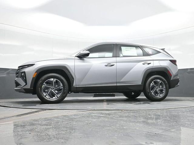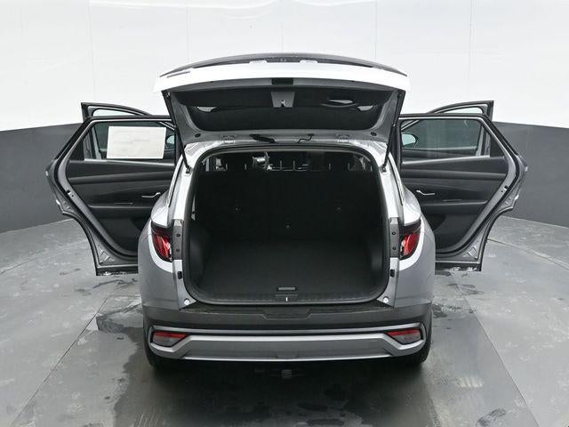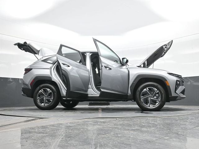 Shimmering Silver 2026 Hyundai Tucson Hybrid Blue SE AWD 6-Speed Automatic 1.6L Turbo GDI 4-Cylinder 1.6L Turbo GDI 4-Cylinder. Option Group 01, 1.6L Turbo GDI 4-Cylinder, 17 x 7.0J Alloy Wheels, 4-Wheel Disc Brakes, 6 Speakers, ABS brakes, Air Conditioning, All Season Fitted Liners, Alloy wheels, AM/FM radio: SiriusXM, Apple CarPlay & Android Auto, Auto High-beam Headlights, Automatic temperature control, Brake assist, Bumpers: body-color, Carpeted Floor Mats, Delay-off headlights, Driver door bin, Driver vanity mirror, Dual front impact airbags, Dual front side impact airbags, Electronic Stability Control, Emergency communication system: None, Four wheel independent suspension, Front anti-roll bar, Front Bucket Seats, Front Center Armrest, Front dual zone A/C, Front reading lights, Fully automatic headlights, Illuminated entry, Low tire pressure warning, Occupant sensing airbag, Outside temperature display, Overhead airbag, Overhead console, Panic alarm, Passenger door bin, Passenger vanity mirror, Power door mirrors, Power steering, Power windows, Radio data system, Radio: AM/FM/HD Audio System, Rear anti-roll bar, Rear reading lights, Rear seat center armrest, Rear side impact airbag, Rear window defroster, Rear window wiper, Remote keyless entry, Security system, Speed control, Split folding rear seat, Spoiler, Stain and Odor Resistant Cloth Seat Trim, Steering wheel mounted audio controls, Tachometer, Telescoping steering wheel, Tilt steering wheel, Tow Hitch, Traction control, Trip computer, and Variably intermittent wipers.